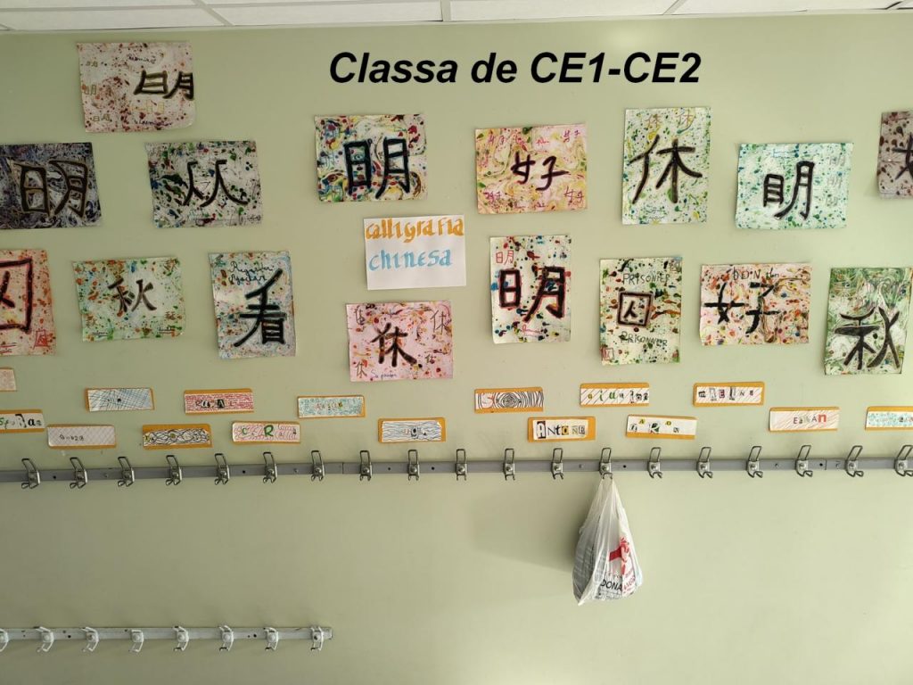 » Avèm fach de caligrafia chinesa. Pel fons avèm mes de pintura dins una barqueta amb d’aiga e d’òli. Amb de pinças avèm mes la fuèlha dins la barqueta e l’avèm joslevada e daissada secar. Aprèp avèm causit un mot e l’avèm escrit en chinés e l’avèm fach amb la tinta negra e tornar passar lo contorn amb un futre daurat. E avèm escrich en francés e en occitan. » Maëlyne, Suzon, Thalia per la classa de CE1-CE2