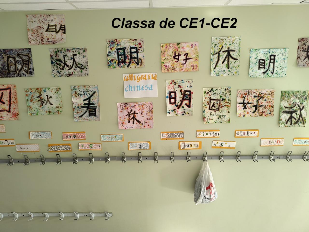 » Avèm fach de caligrafia chinesa. Pel fons avèm mes de pintura dins una barqueta amb d’aiga e d’òli. Amb de pinças avèm mes la fuèlha dins la barqueta e l’avèm joslevada e daissada secar. Aprèp avèm causit un mot e l’avèm escrit en chinés e l’avèm fach amb la tinta negra e tornar passar lo contorn amb un futre daurat. E avèm escrich en francés e en occitan. » Maëlyne, Suzon, Thalia per la classa de CE1-CE2